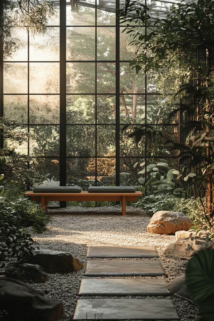 The conservatory feels alive with air and balance. Glass panels, wood tones, and natural light merge in poetic simplicity. Greenery thrives while minimal furniture keeps the space clear and free. It’s beauty through restraint, joy through calm.