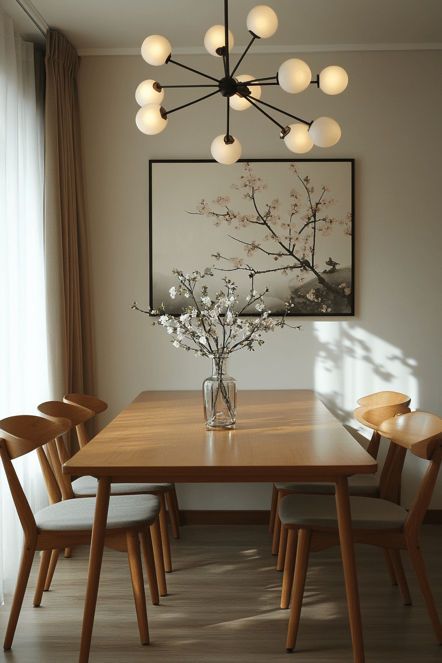 Your dining area becomes a moment of still joy in this Scandinavian Japanese design. Smooth wood, curved lines, and gentle tones turn each meal into a peaceful ritual. The minimal layout makes connection the focus of every gathering. Natural light dances across simple ceramics and clean surfaces.