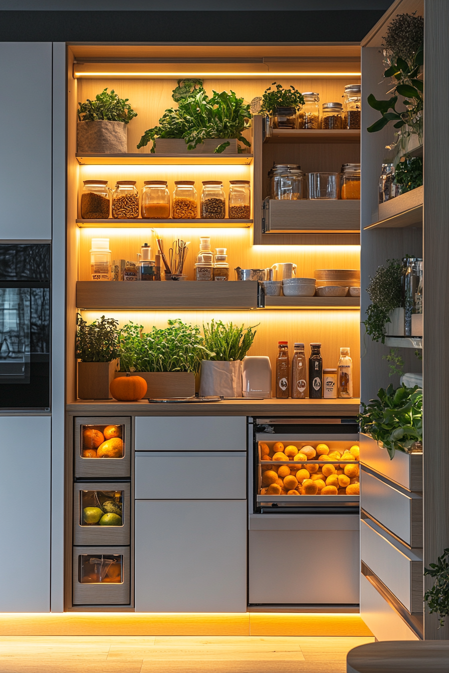 Simplicity becomes beautiful in this thoughtfully designed pantry. Soft woods, clear organization, and warm lighting make order feel inspiring. The design promotes mindfulness in every daily task. Each shelf radiates calm energy.