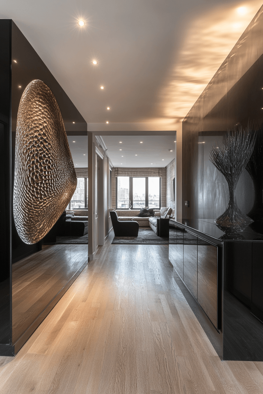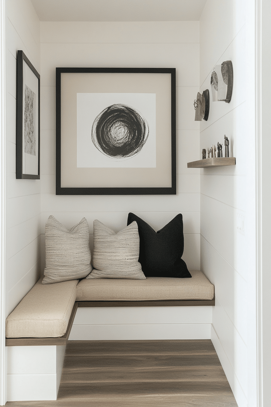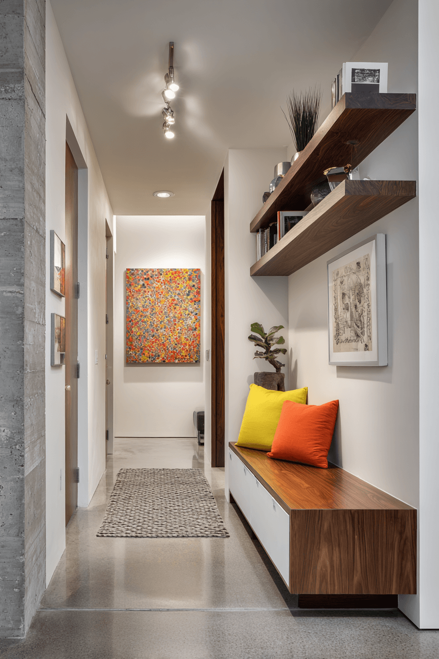 Creative displays turn this tiny apartment entryway into a personalized space filled with character. Floating shelves showcase artwork and decorative items without taking up floor space. Stylish hooks double as both storage and design features. Carefully placed lighting highlights each detail beautifully. Personality shines through in every corner. Design an entry that reflects your unique style and creativity.