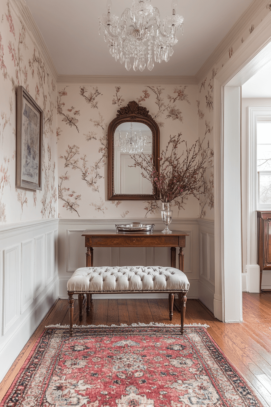Timeless design elements bring elegance into this tiny apartment entryway with a refined and welcoming feel. A classic console paired with soft seating creates a warm focal point. Gentle lighting and artwork enhance the overall atmosphere. The space feels polished without being overwhelming. Comfort and sophistication blend beautifully. Introduce classic touches that elevate your entry with ease.
