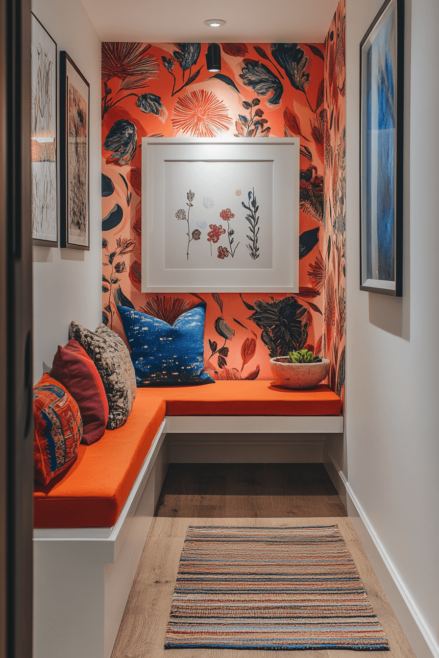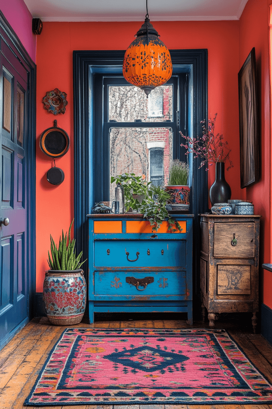Playful color choices energize this tiny apartment entryway with bold personality and creative flair. Vibrant tones and unique decor pieces bring life into the space. Mixing styles creates depth and visual interest. Statement accents draw attention without overwhelming the layout. The space feels lively and expressive. Design an entry that celebrates color and individuality.