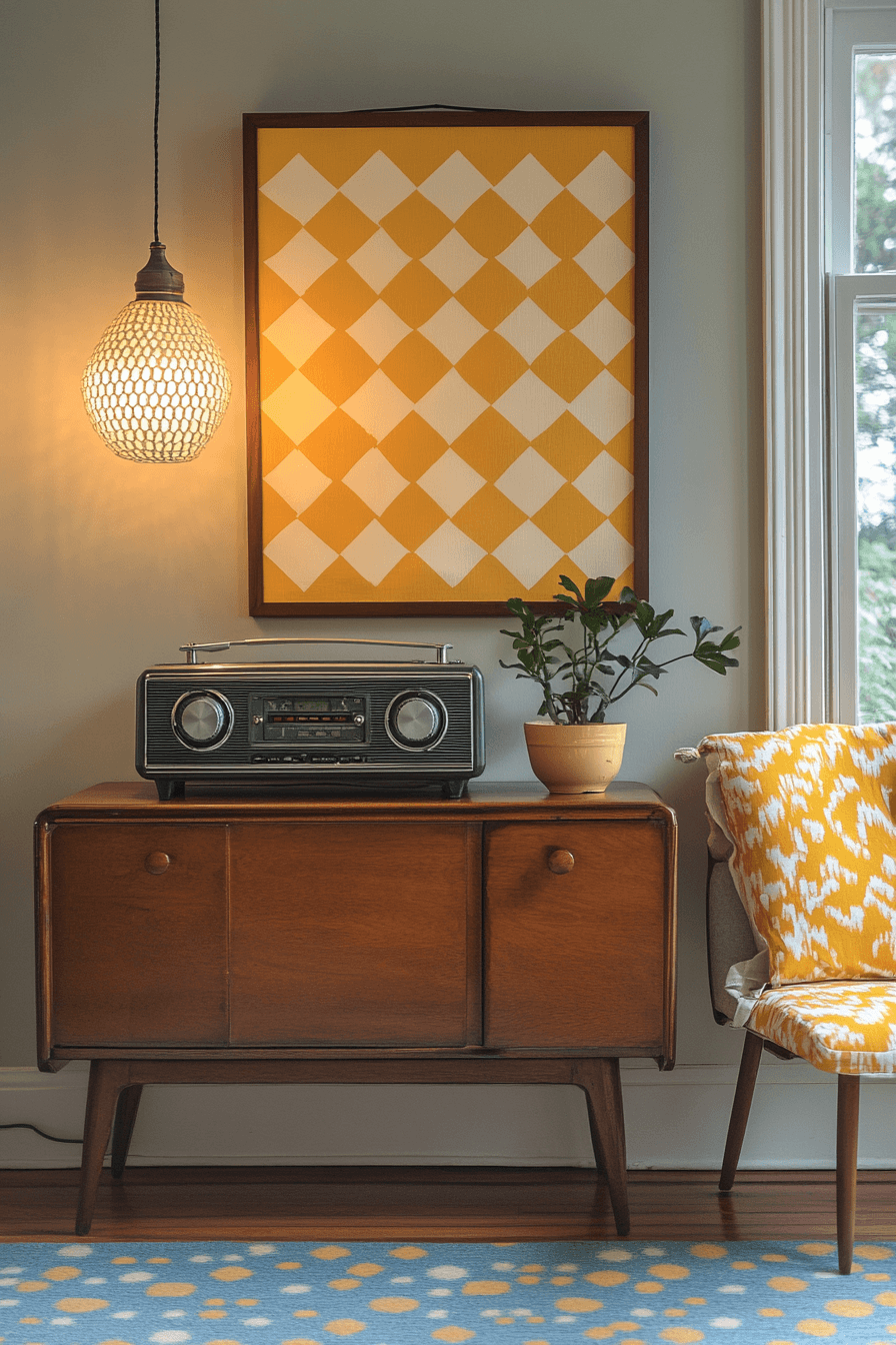 Retro-inspired styling adds a playful and nostalgic vibe to this tiny apartment entryway. Bold colors and mid-century influences create a lively atmosphere. Unique decor pieces bring personality and charm. The space feels fun and expressive. Even small layouts can feel dynamic with this approach. Add retro flair to create an entry that stands out.