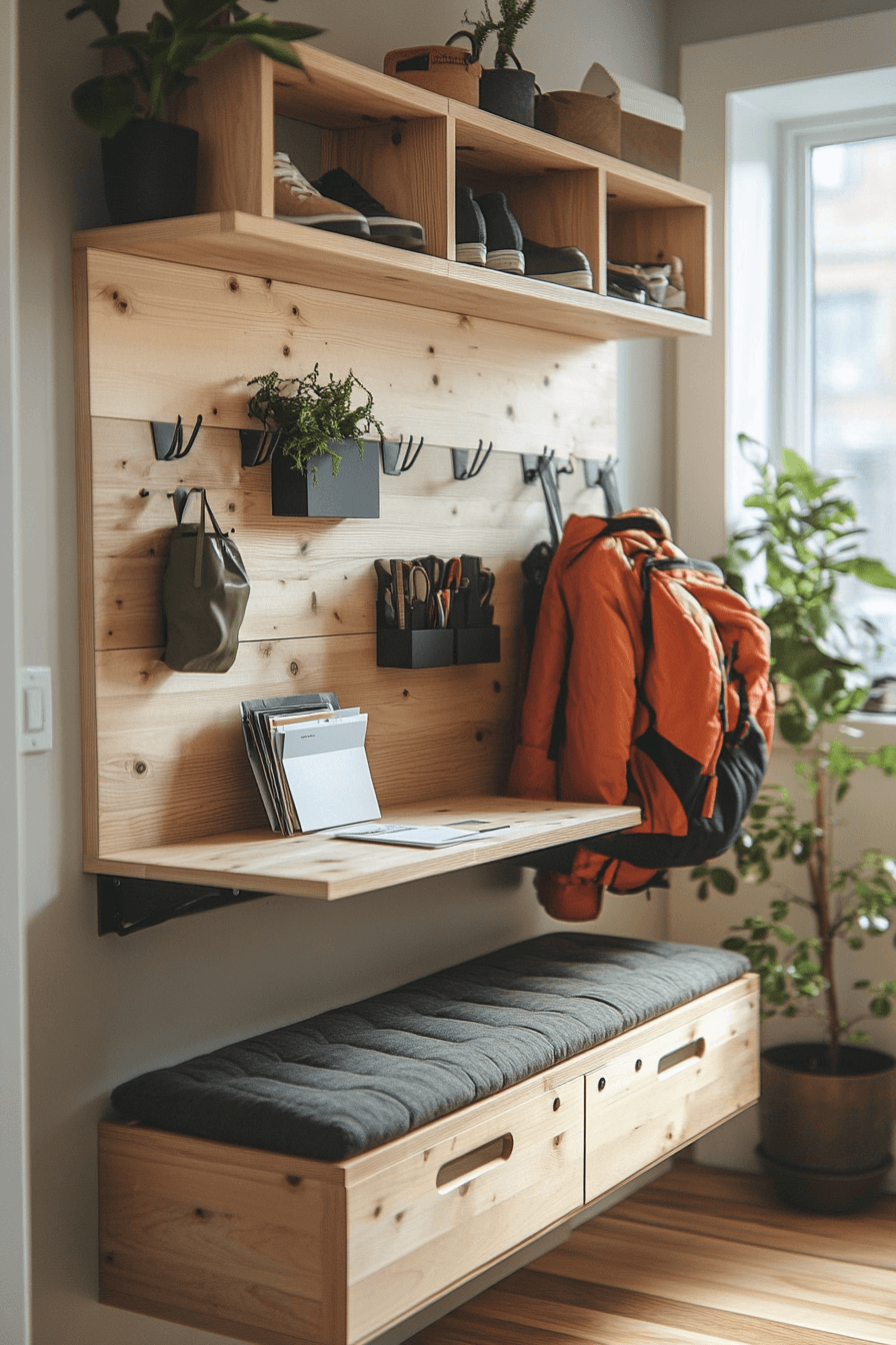 Smart design keeps this tiny apartment entryway organized and efficient with a slim hall tree solution. Integrated hooks and compact storage ensure everything has its place. A foldable seat offers convenience while saving space when not in use. Light finishes help maintain an open and uncluttered look. Movement and storage blend seamlessly. Improve your daily routine with a layout designed for both ease and style.