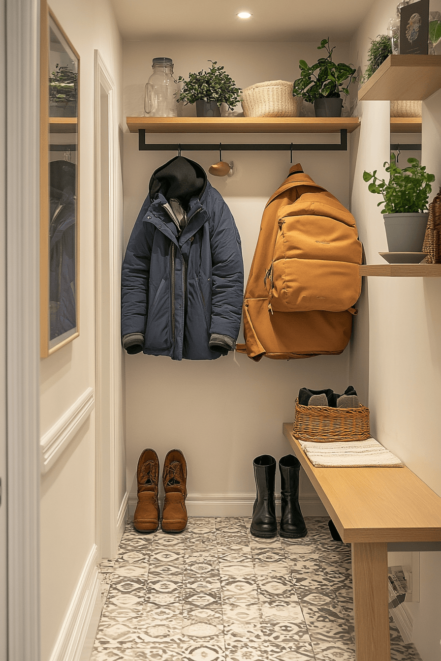 Floating storage keeps this tiny apartment entryway clean and efficient while maximizing every inch. Elevated shelves provide space for essentials without crowding the floor. Modern finishes maintain a sleek and stylish look. Hooks beneath add extra functionality for everyday items. The overall design feels organized and streamlined. Simplify your entry with solutions that make the most of limited space.