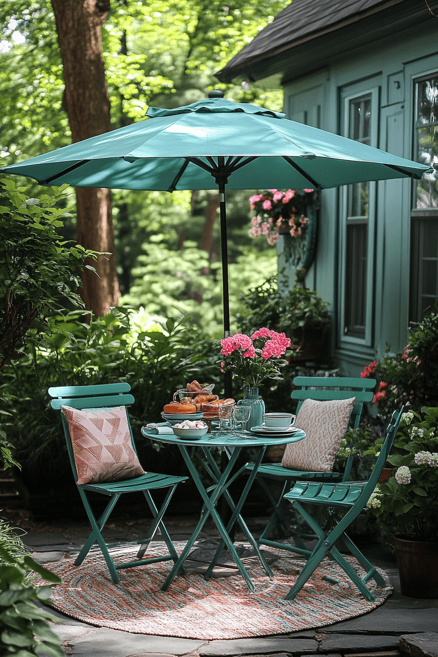 Morning-ready styling transforms a tiny apartment patio ideas setup into a cheerful breakfast nook. A compact table paired with light seating keeps everything open and practical. Bright plants or flowers add color and freshness. Soft shade elements maintain comfort while allowing natural light. The space feels energizing and welcoming. Start your day in a patio that feels uplifting and bright.