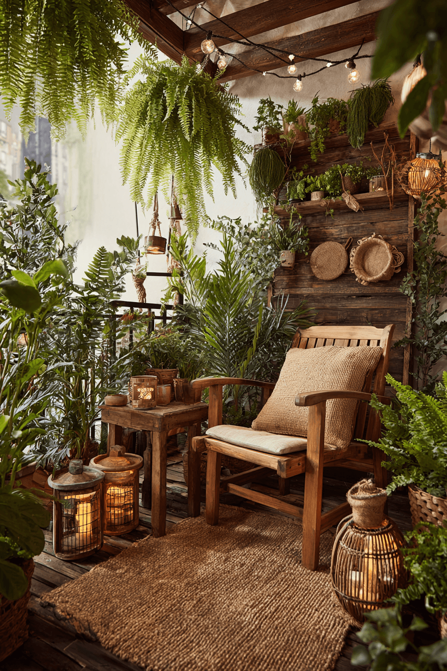 Woodland-inspired textures create a peaceful tiny apartment patio ideas space that feels connected to nature. Rustic materials and greenery bring warmth and depth. Soft lighting enhances the cozy atmosphere during evenings. Natural elements add a calming presence. The patio feels like a quiet outdoor retreat. Design a space that reconnects you with nature.