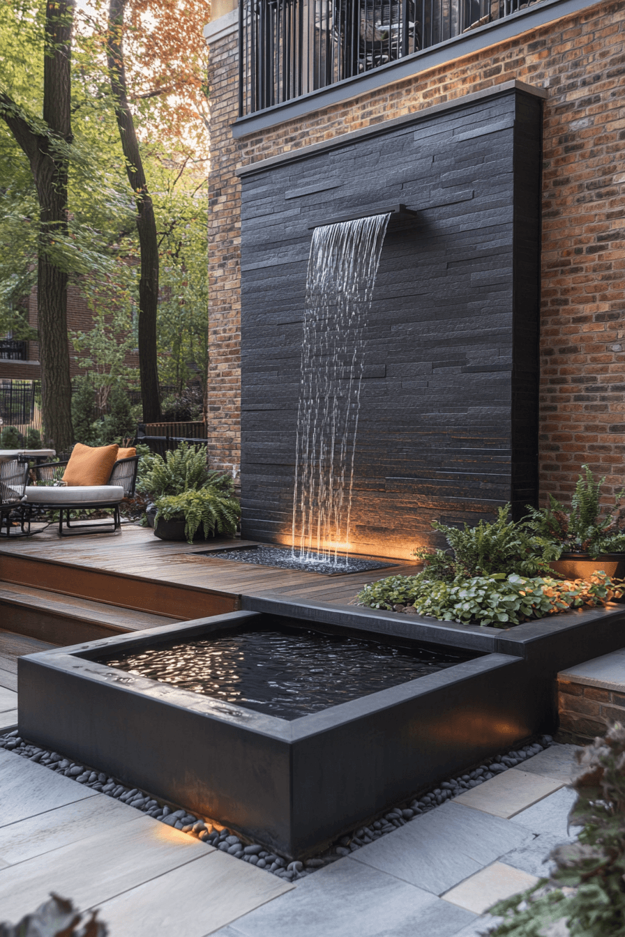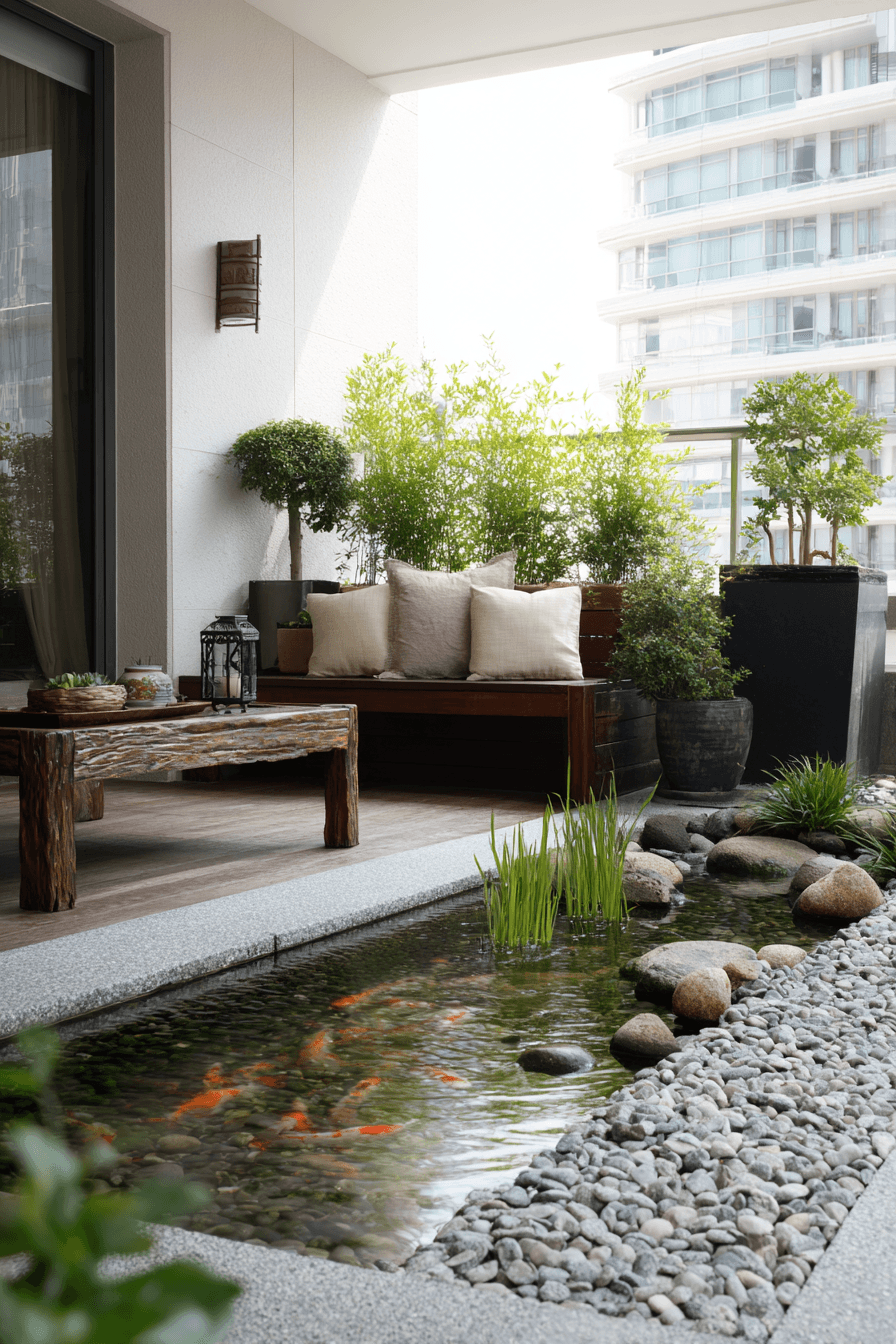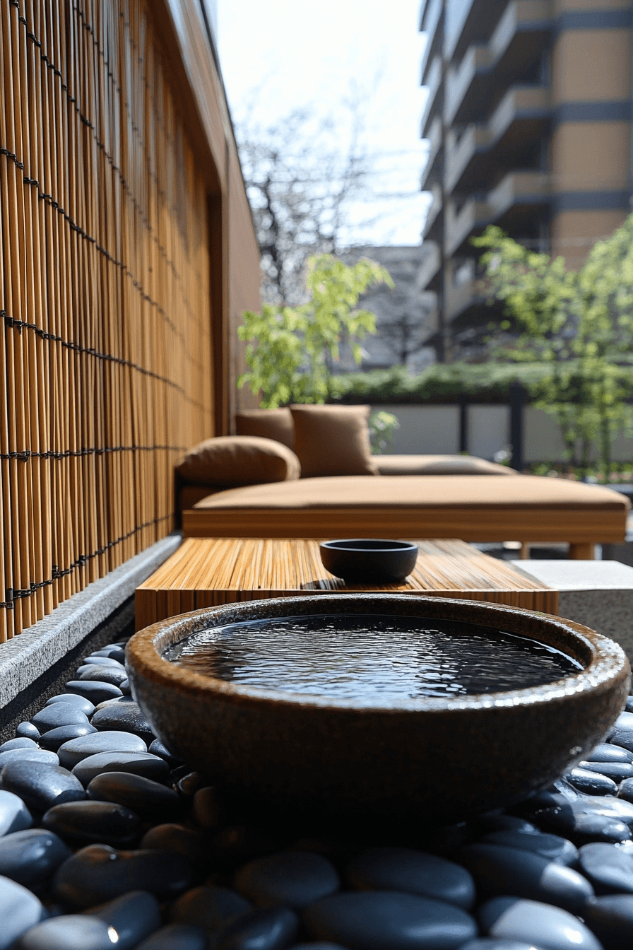 Water-inspired decor adds calm elegance to a tiny apartment patio ideas layout with a small feature. A decorative basin with stones and plants creates a peaceful focal point. Gentle movement enhances relaxation. The space feels balanced and refined. Small details elevate the overall design. Add a calming water touch to your patio.