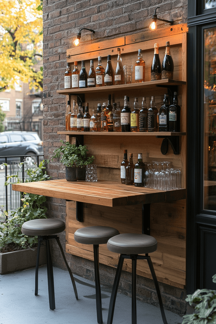 Social functionality shines in a tiny apartment patio ideas setup designed with a compact bar feature. A foldable table paired with slim seating maximizes usability. Shelving keeps drinks and accessories organized. The space feels modern and inviting. Even small patios can host great moments. Set up a patio bar that’s perfect for entertaining.