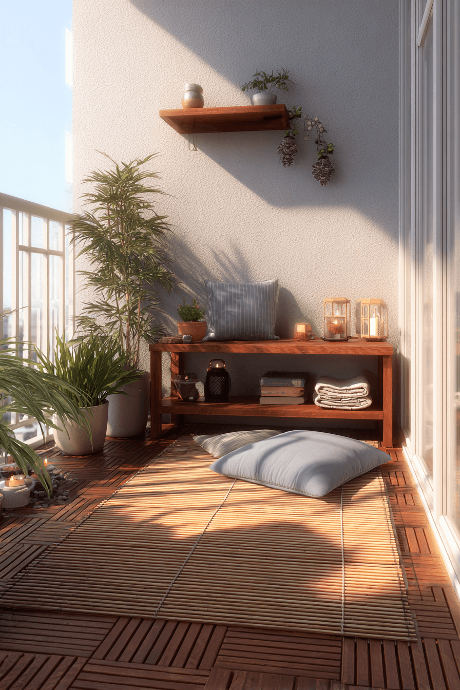 Peaceful energy flows through a tiny apartment patio ideas setup inspired by Zen design and simplicity. Clean lines and minimal decor keep the space clutter-free and serene. Natural materials like bamboo and stone create balance and warmth. Subtle accents enhance the calming effect without distraction. The atmosphere feels grounded and tranquil. Create a patio that encourages mindfulness and relaxation.