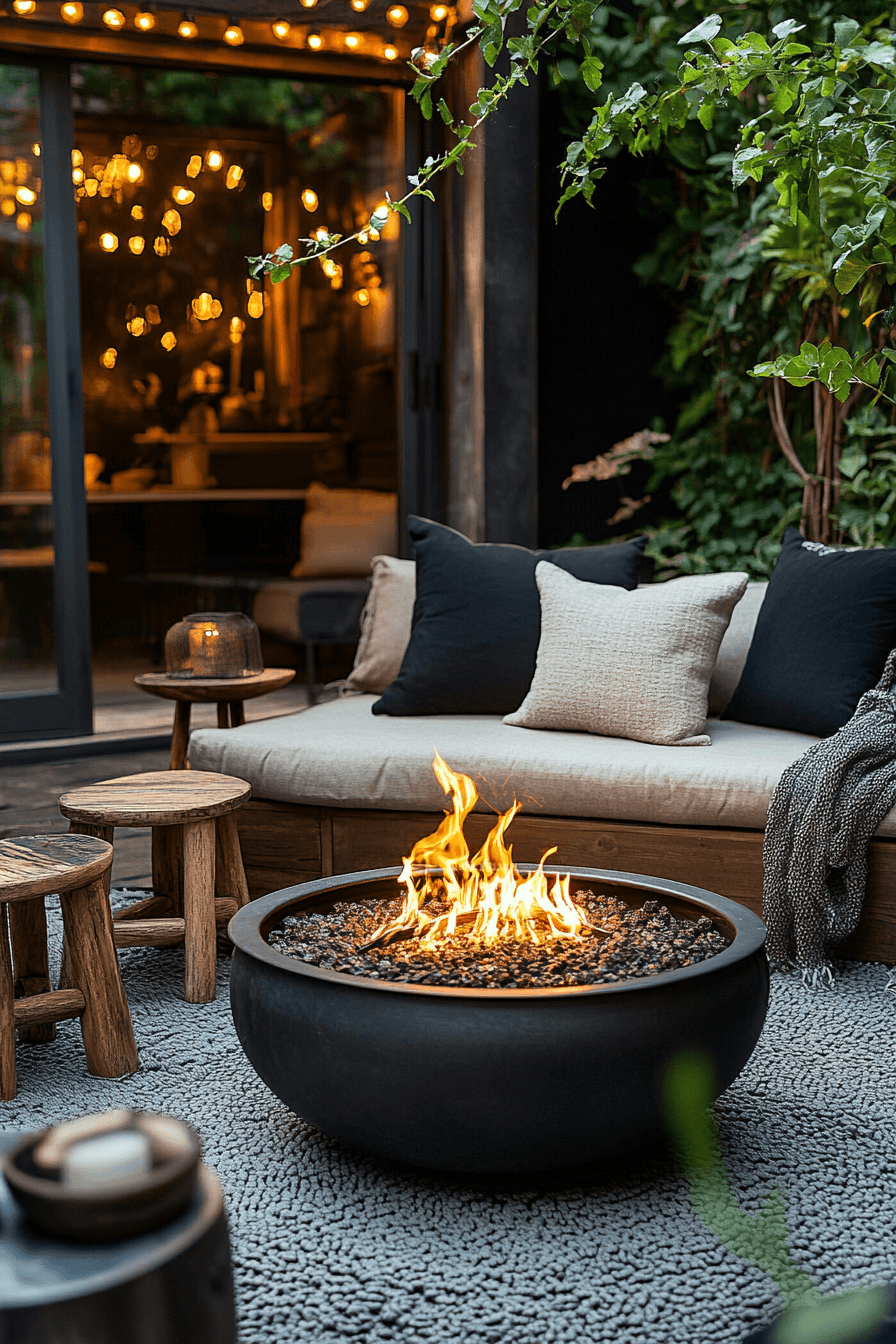 Warm glow transforms a tiny apartment patio ideas space with a compact fire feature that adds ambiance and comfort. Soft seating around the fire creates a welcoming setup. Flickering light enhances the mood during evenings. The patio feels cozy and relaxing. Even limited space can feel magical. Add warmth to your patio with fire-inspired design.