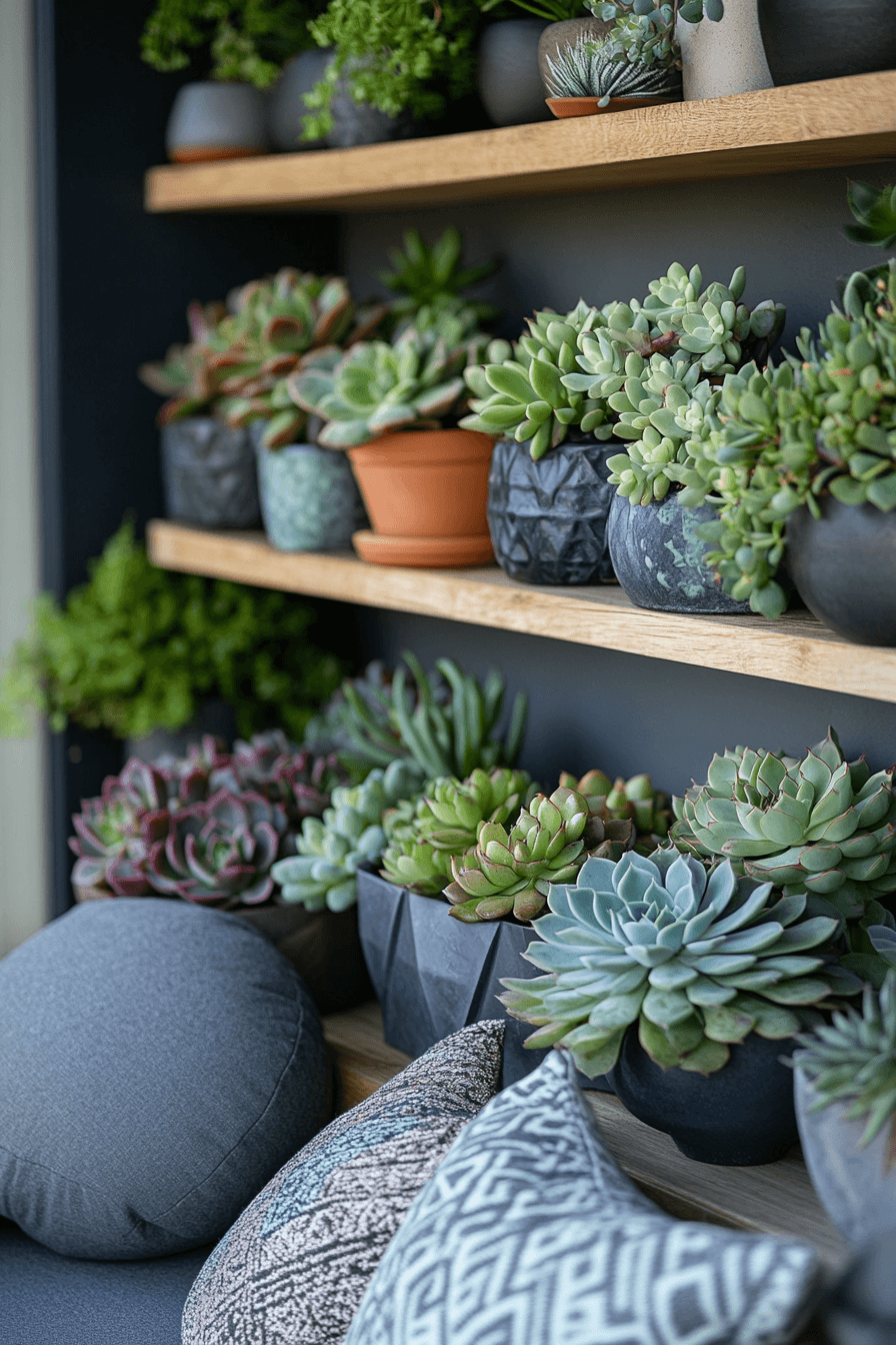Low-effort greenery enhances a tiny apartment patio ideas layout with succulent plants that offer style and simplicity. A mix of textures and tones creates visual interest. Minimal care makes them ideal for busy lifestyles. Strategic placement keeps the design clean. The space feels fresh and modern. Style your patio with easy-to-maintain greenery.