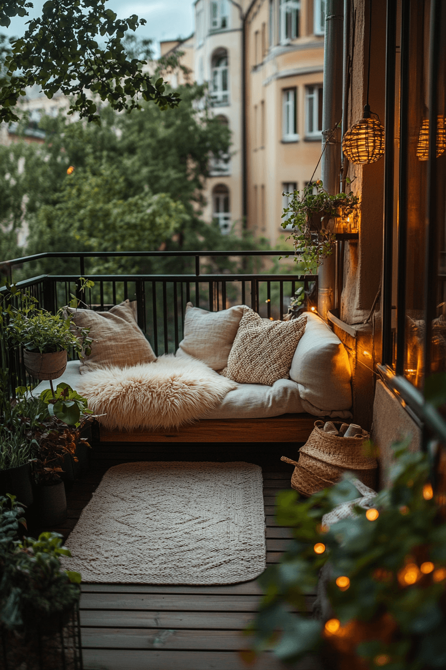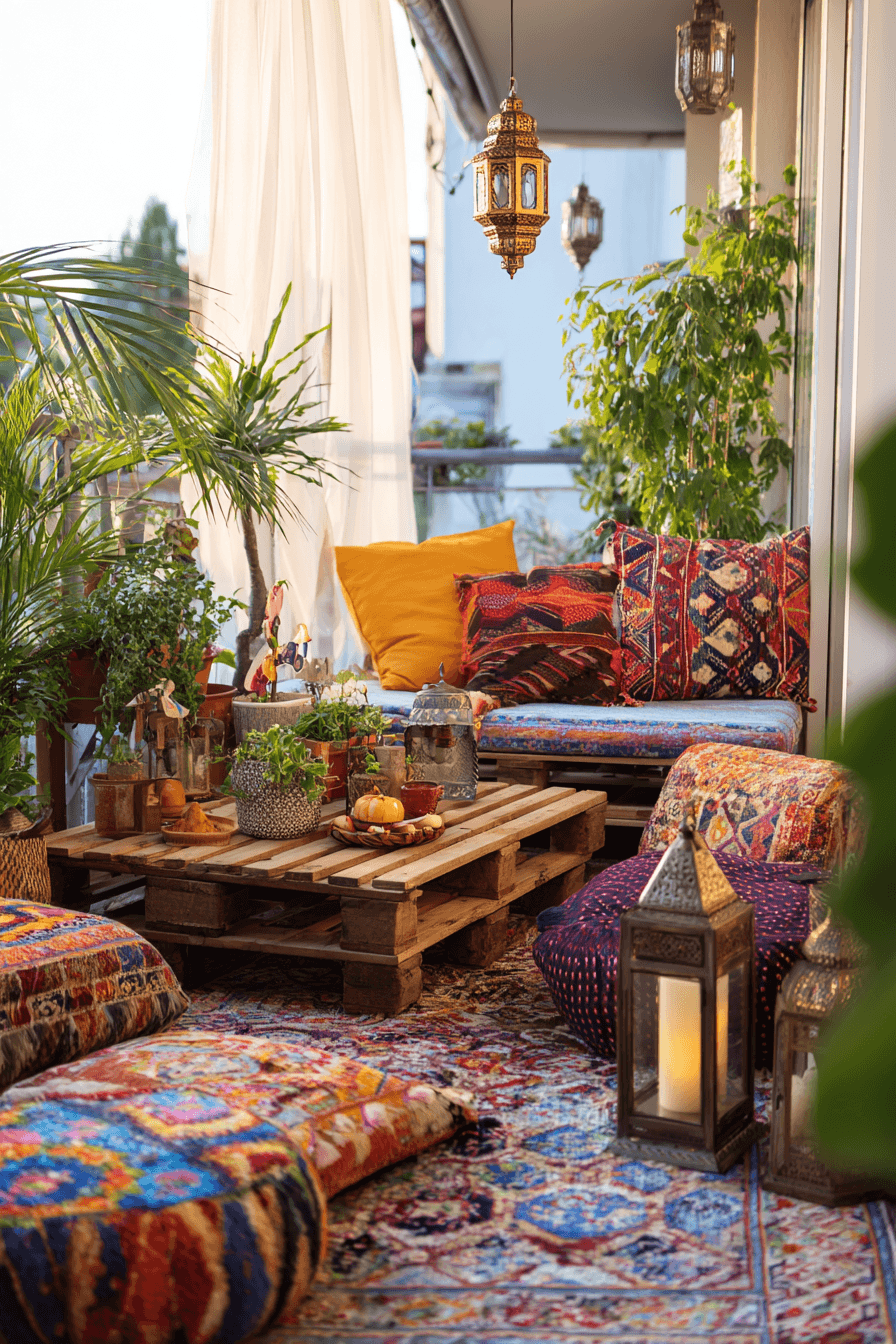 Free-spirited styling transforms a tiny apartment patio ideas space into a vibrant bohemian-inspired retreat. Layered fabrics, plush seating, and warm lighting create a cozy outdoor vibe. Hanging plants and mixed textures add depth and personality. The space feels expressive and full of charm. Perfect for relaxing, journaling, or enjoying quiet moments. Bring a carefree boho aesthetic into your patio and make it your own.