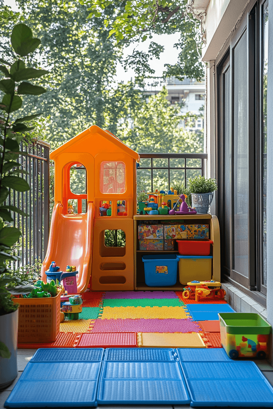 Playful design brings energy to a tiny apartment patio ideas layout that’s perfect for kids and creativity. Compact features and colorful accents make the space engaging. Smart storage keeps everything organized. The patio feels fun and lively. Great for encouraging imagination outdoors. Create a patio space filled with joy and activity.