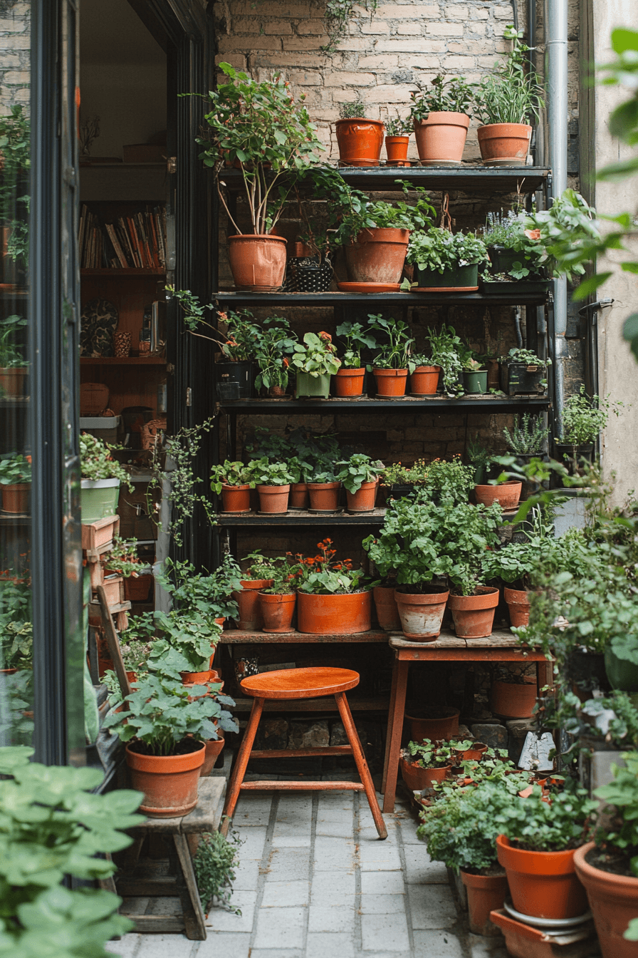 Layered plant displays maximize greenery in a tiny apartment patio ideas setup while keeping everything organized. Multi-level stands add depth and dimension. A mix of plants creates visual interest. The space feels vibrant and full. Ideal for small patios with limited room. Grow a thriving garden with vertical plant solutions.