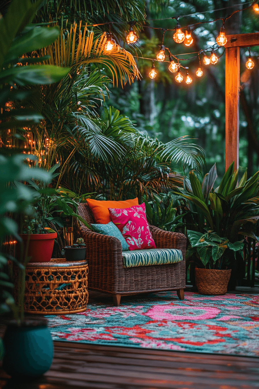 Lush greenery and tropical elements give a tiny apartment patio ideas design a bright and vacation-like feel. Woven furniture and layered plants create a warm, inviting environment. Compact planters maximize greenery without limiting movement. Pops of color bring energy and vibrancy. The space feels cheerful and refreshing. Turn your patio into a tropical-inspired escape that feels like a getaway.