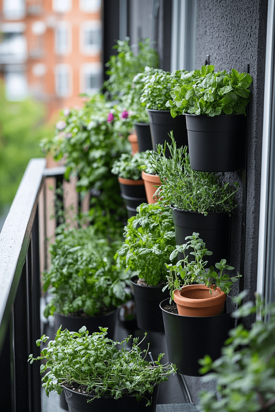 Functional greenery brings life to a tiny apartment patio ideas design that includes a compact herb garden. Wall-mounted planters and vertical racks keep everything organized and efficient. Each plant adds color and practical value. Neatly arranged pots create a tidy and charming display. The space feels vibrant and useful. Start growing your own herbs and enjoy fresh ingredients right at home.