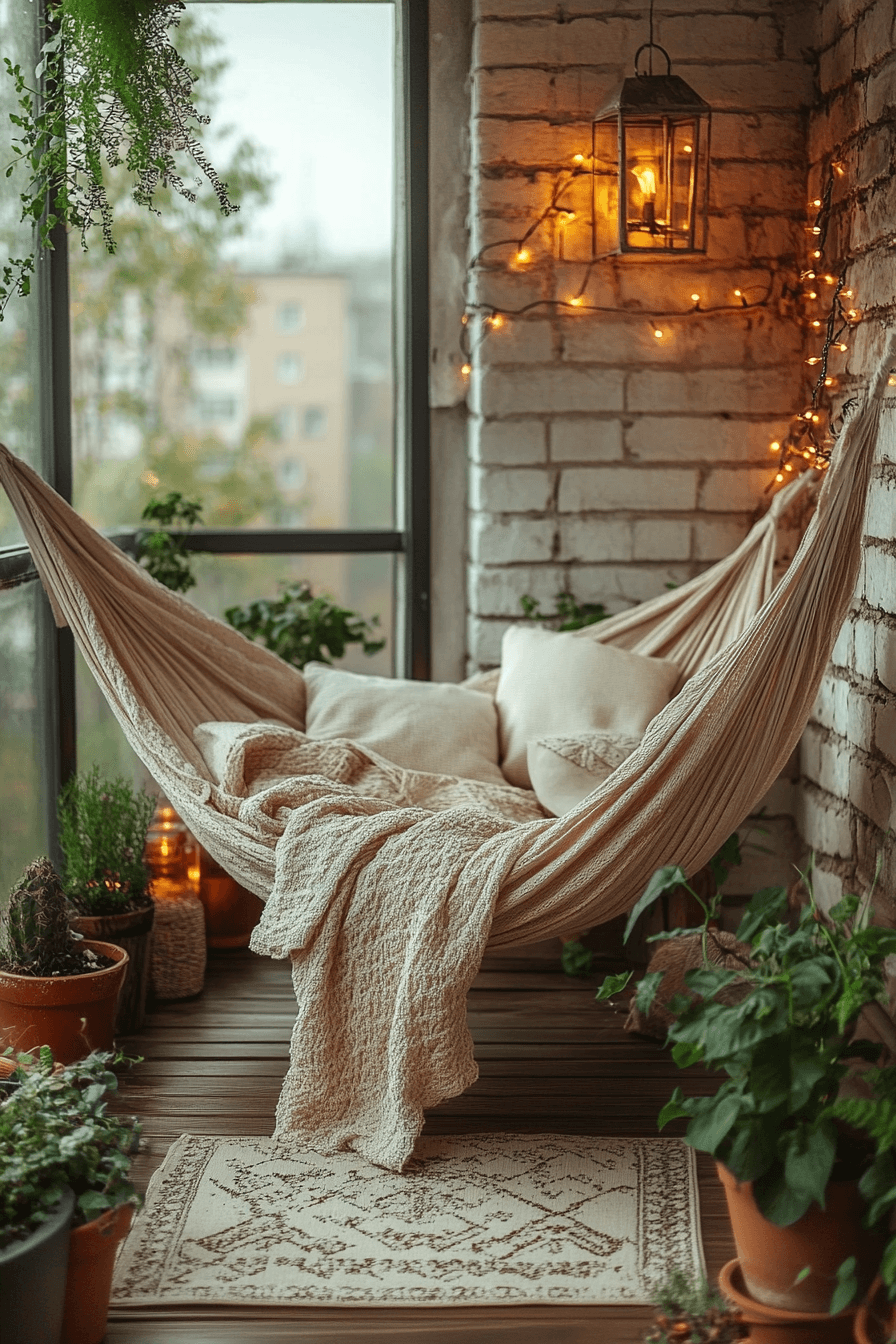 Laid-back luxury fills a tiny apartment patio ideas setup featuring a hammock-inspired relaxation zone. A compact hammock paired with soft lighting and greenery creates a dreamy environment. Cushions and textures enhance comfort while maintaining style. Smart design keeps everything neat and uncluttered. Even the smallest patios can feel indulgent. Create your own relaxing retreat that feels like an escape.