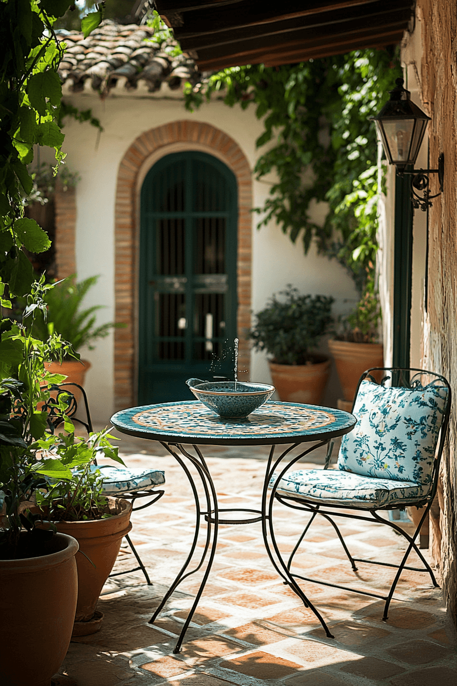 Sun-drenched charm fills a tiny apartment patio ideas space with Mediterranean-inspired warmth and style. Terra cotta planters and decorative accents create a lively atmosphere. A small table setup keeps things functional without crowding the area. Bright colors and textures enhance the look. The patio feels inviting and relaxed. Add Mediterranean character to your outdoor space and enjoy the vibe.