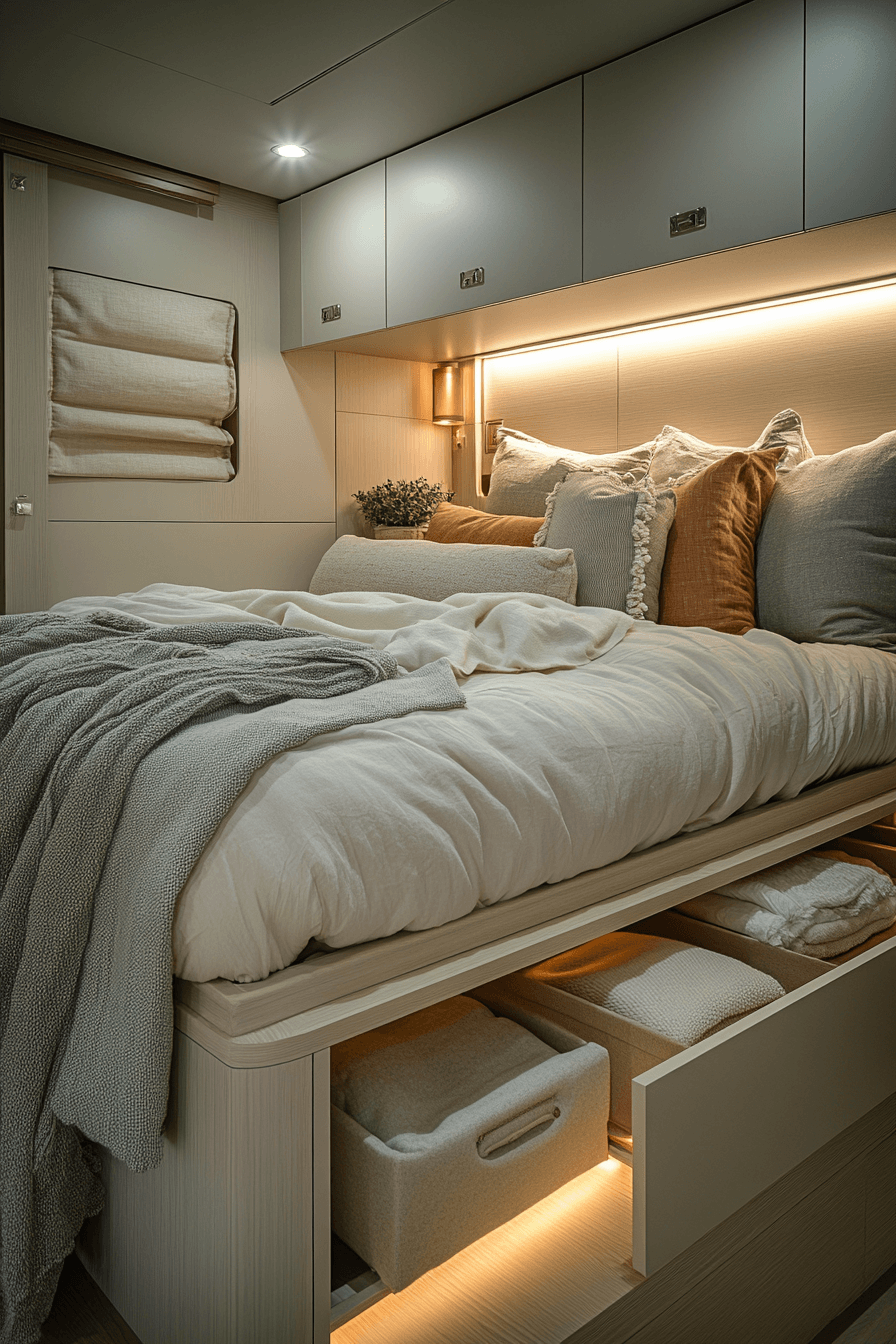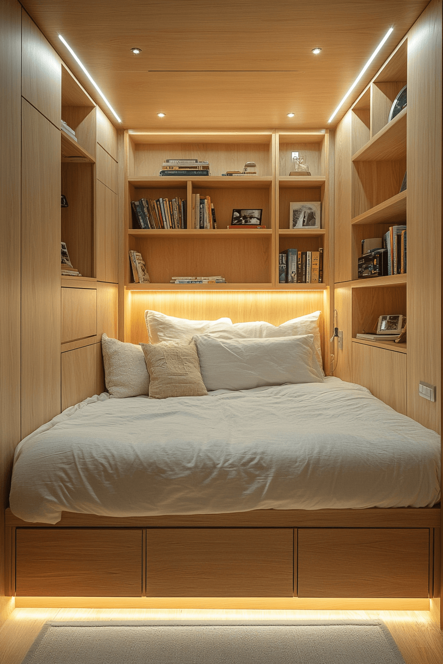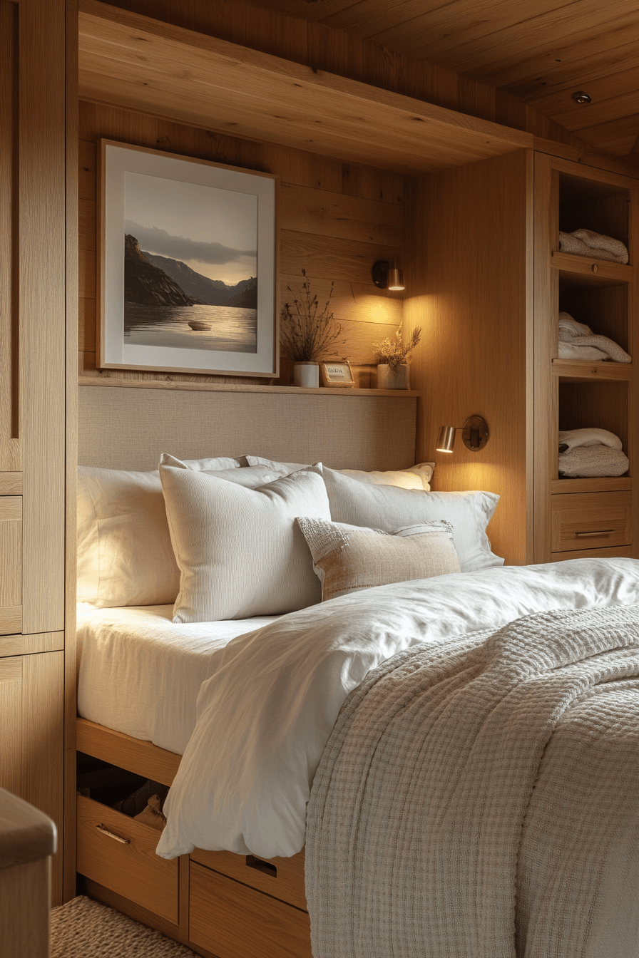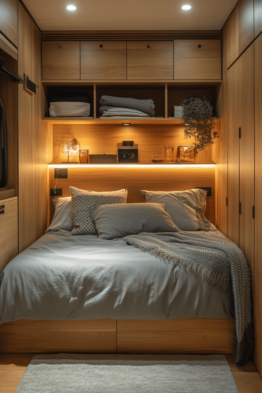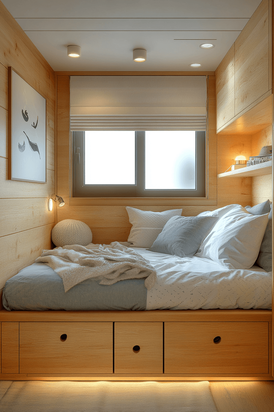 Stay organized effortlessly with tiny bedroom decor that uses beds with built-in storage. Hidden drawers provide extra room without taking up space. This helps tiny bedroom decor stay neat and efficient. The design remains clean and modern. It’s both practical and stylish. Discover more smart storage with these tiny bedroom decor ideas.