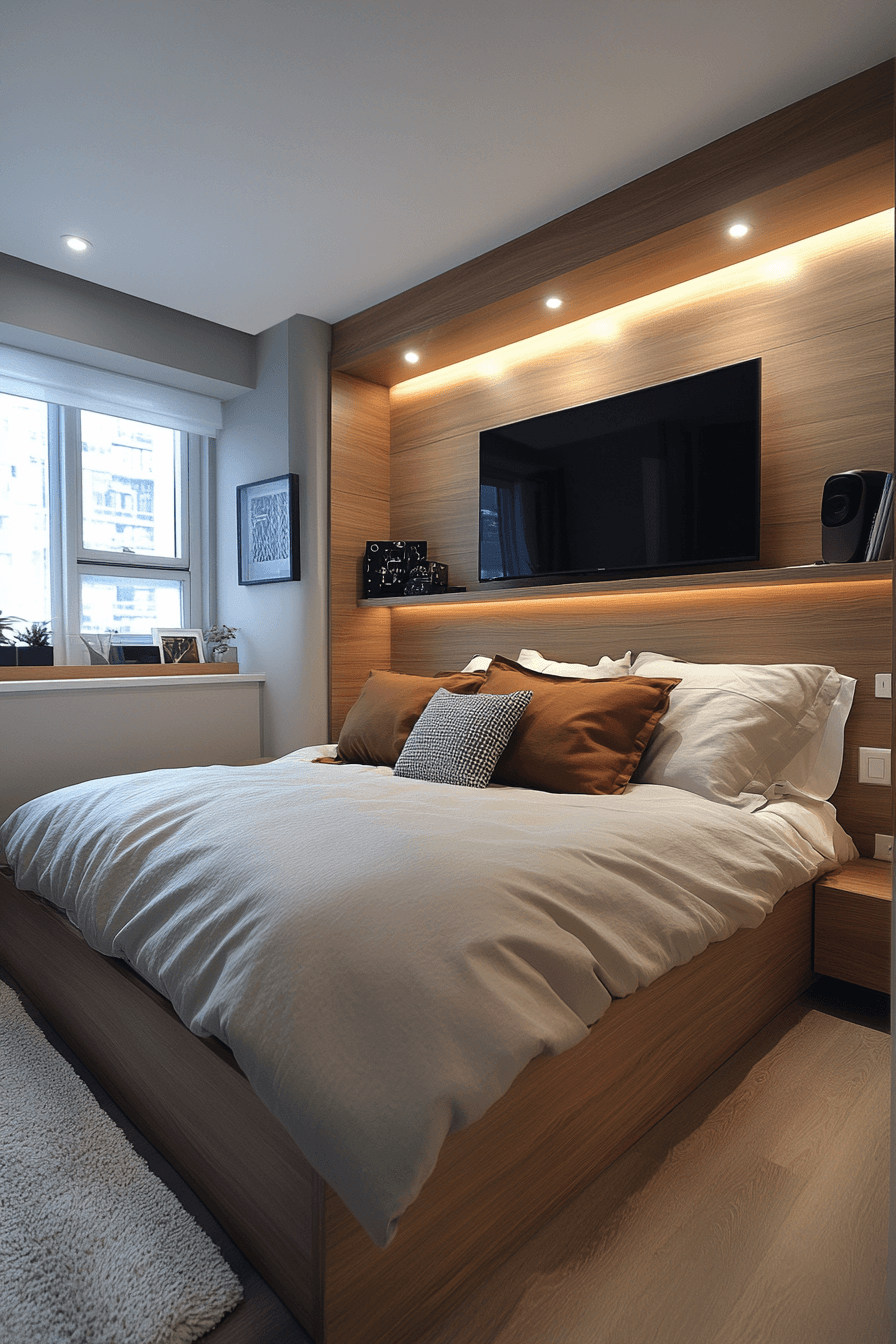 Maintain a clean aesthetic with tiny bedroom decor that uses a streamlined media setup. Wall-mounted screens eliminate bulky furniture. This keeps tiny bedroom decor organized and modern. Slim storage options add functionality without clutter. The design feels sleek and intentional. Upgrade your space with these tiny bedroom decor ideas.