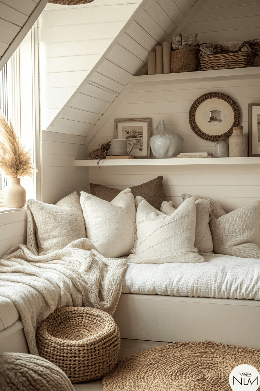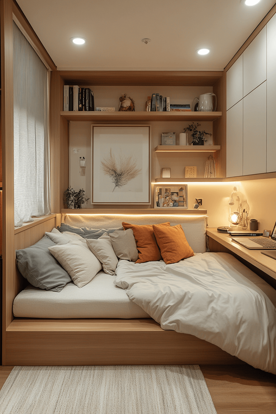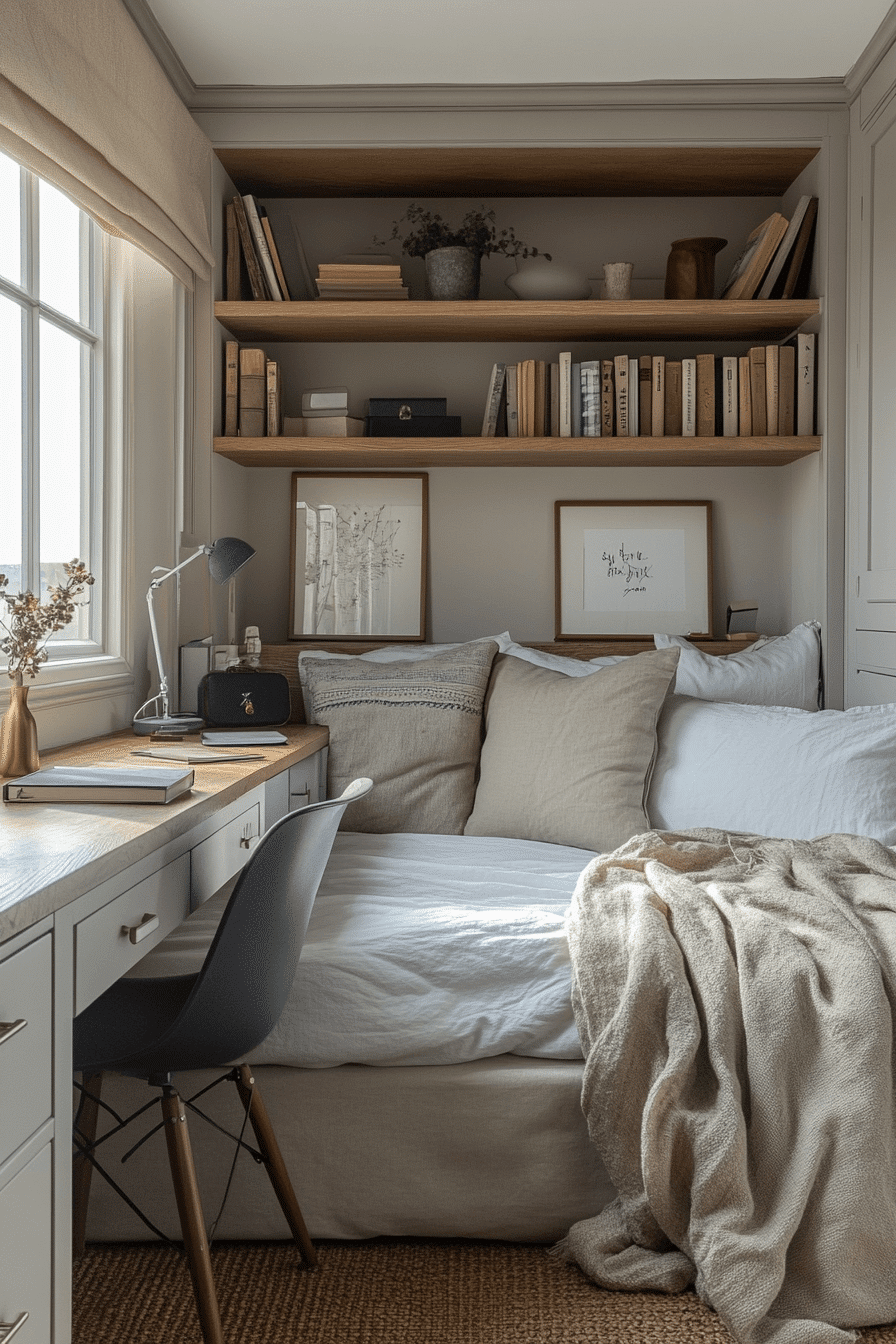 Add charm and function with tiny bedroom decor that includes a cozy daybed nook. This setup works for both lounging and sleeping. Layered textiles create warmth. This keeps tiny bedroom decor versatile and inviting. The overall feel is relaxed and stylish. Create your cozy retreat with these tiny bedroom decor ideas.