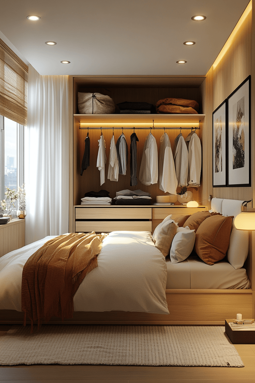Keep everything seamless with tiny bedroom decor that uses built-in storage for a clean look. Vertical shelving and hidden compartments maximize space. This allows tiny bedroom decor to feel open and uncluttered. The integrated design adds a polished finish. Styled carefully, it enhances the room’s aesthetic. Upgrade your storage with these tiny bedroom decor ideas.