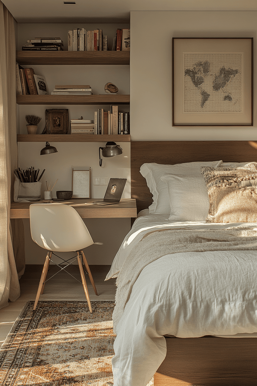 Design a sleek and efficient space with tiny bedroom decor that incorporates floating desks for a modern touch. Wall-mounted surfaces keep the floor clear and open. This makes tiny bedroom decor feel lighter and more spacious. Pairing with compact shelving keeps everything organized. The clean lines add a contemporary feel. Create your perfect setup with these tiny bedroom decor ideas.