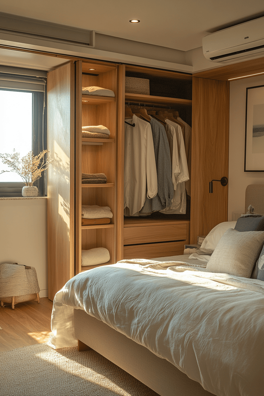 Keep things light and modern with tiny bedroom decor that uses open clothing rails for storage. Removing bulky wardrobes creates a more open feel. This keeps tiny bedroom decor clean and airy. Neatly arranged items double as decor. The result feels simple yet stylish. Style your wardrobe with these tiny bedroom decor ideas.