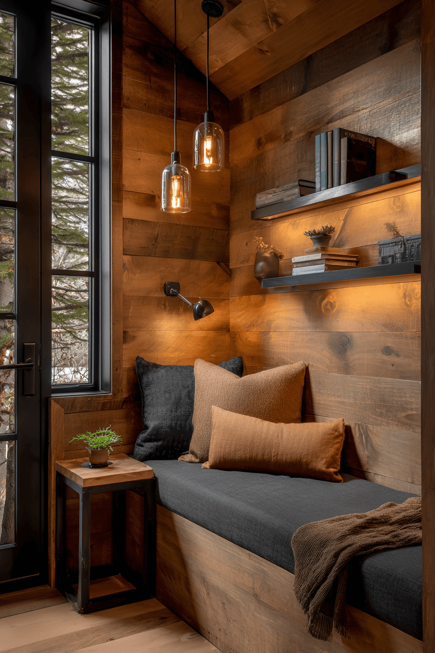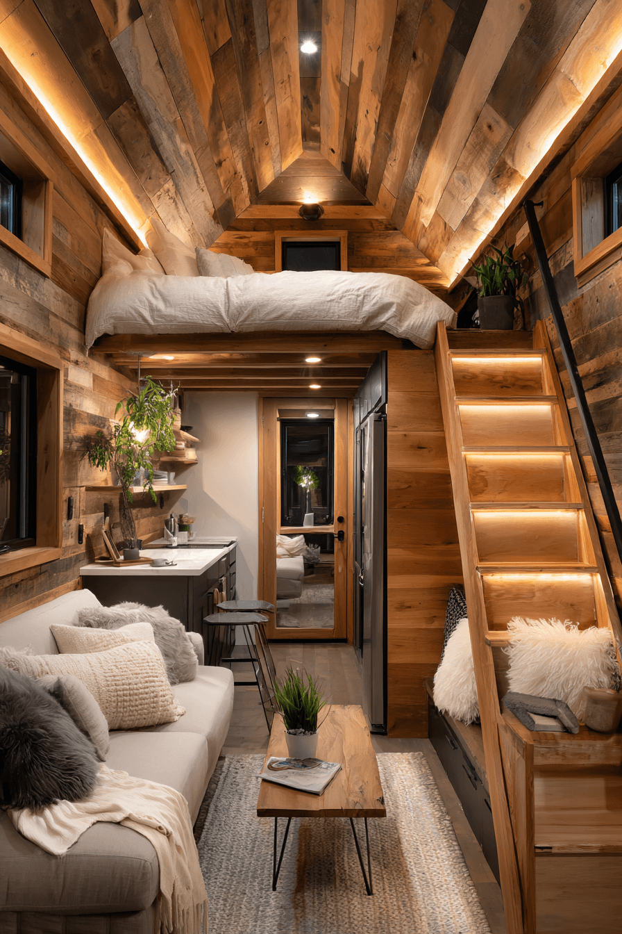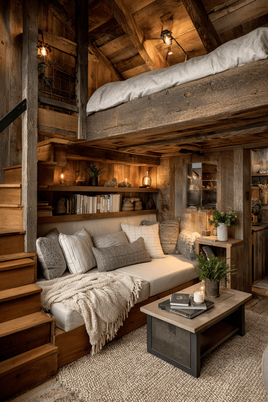 Under-loft areas become functional highlights in tiny cabins interiors when transformed into cozy seating zones. Soft textures and warm lighting create a comfortable place to relax. Built-in storage keeps the area organized. Layered design adds depth and character. The space feels inviting and purposeful. Turn overlooked areas into your favorite cozy corner.