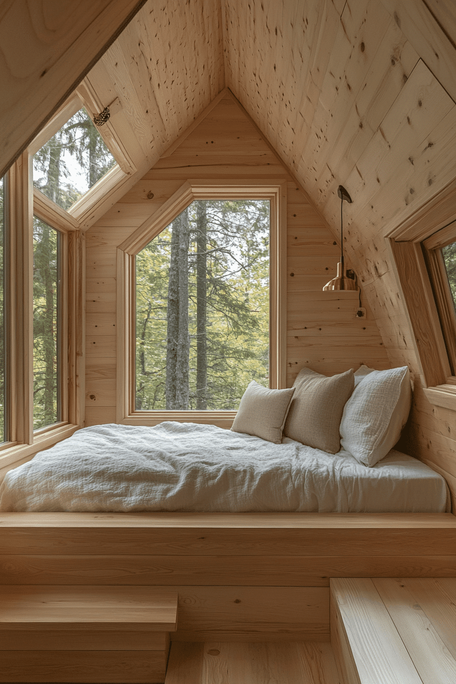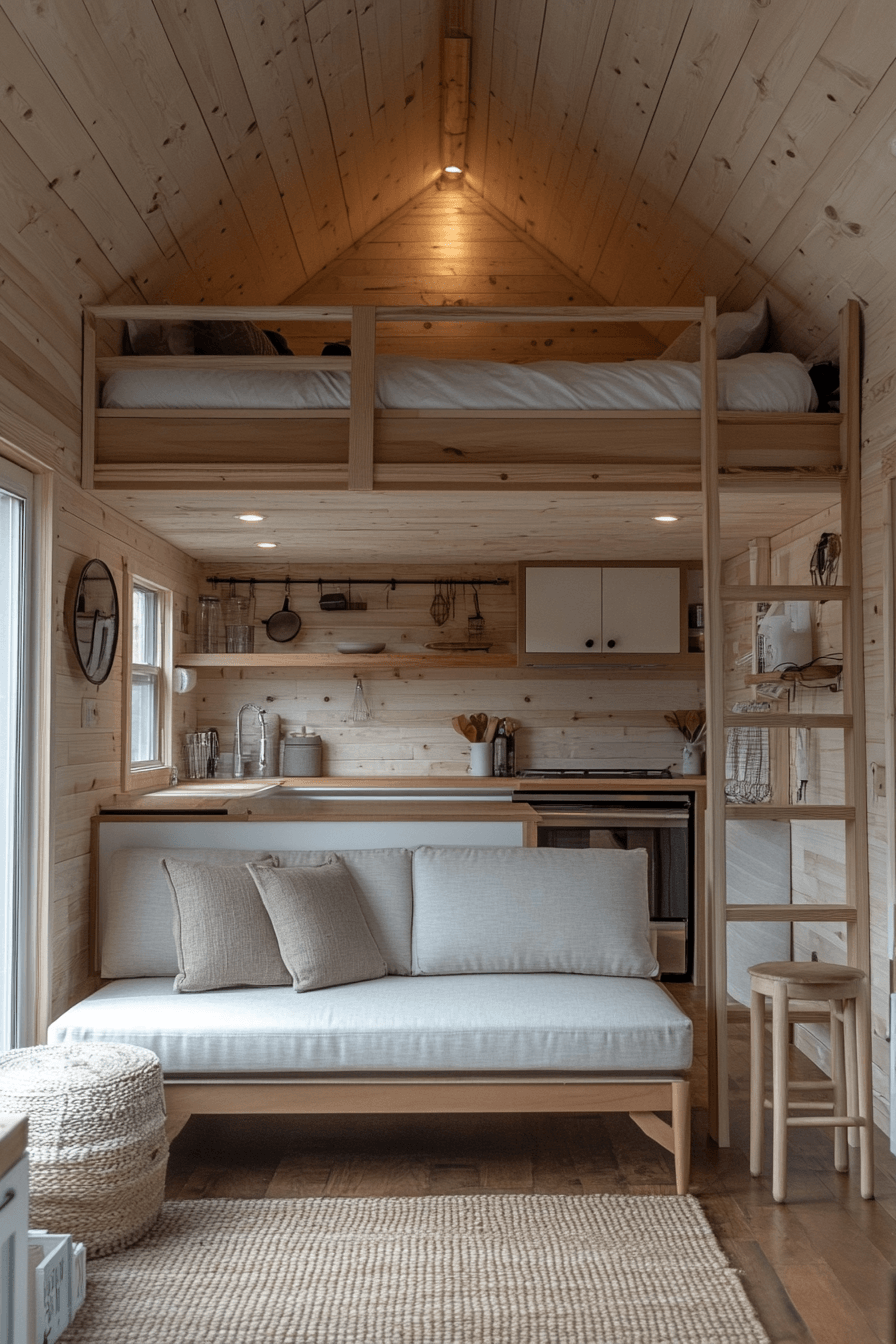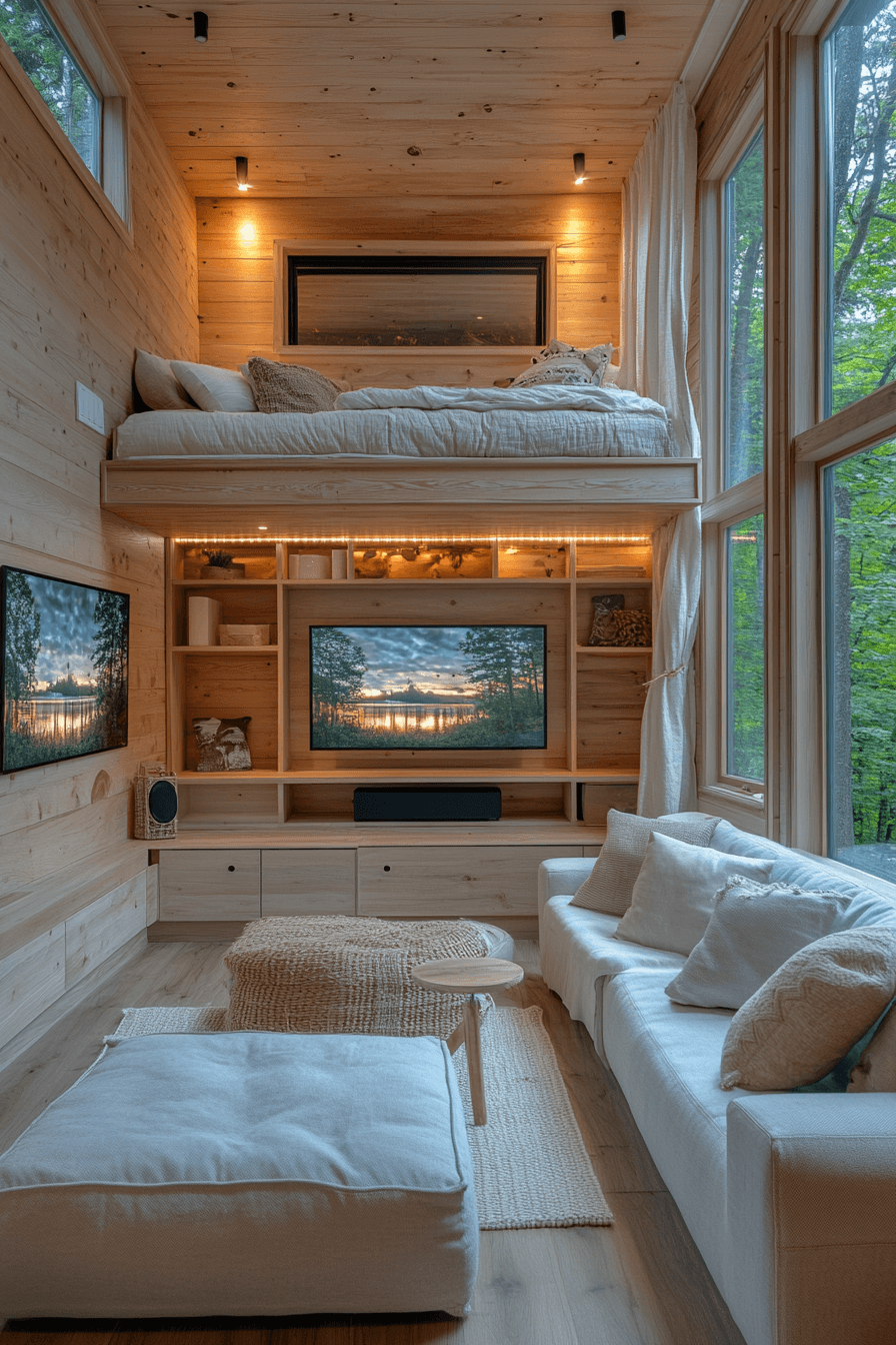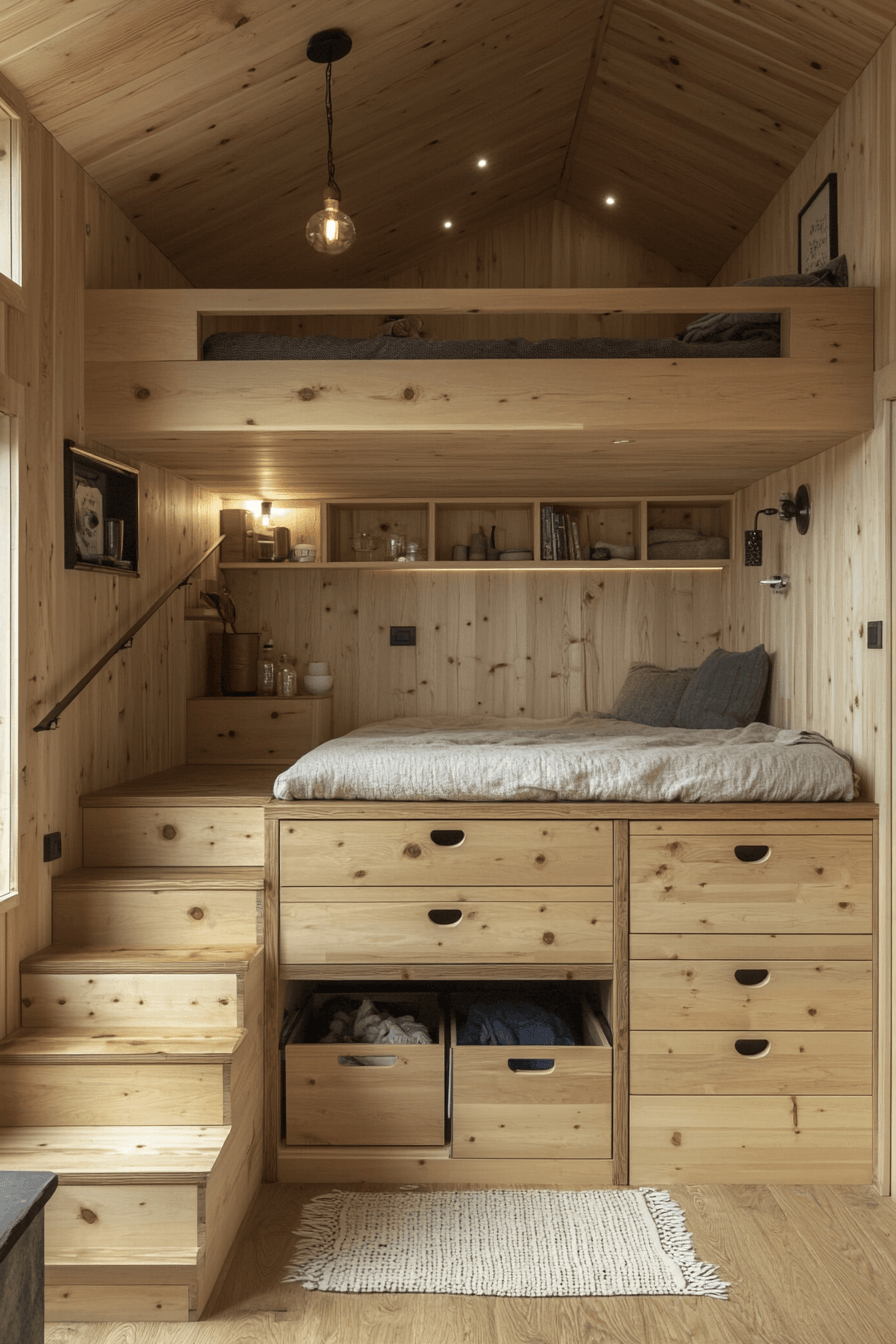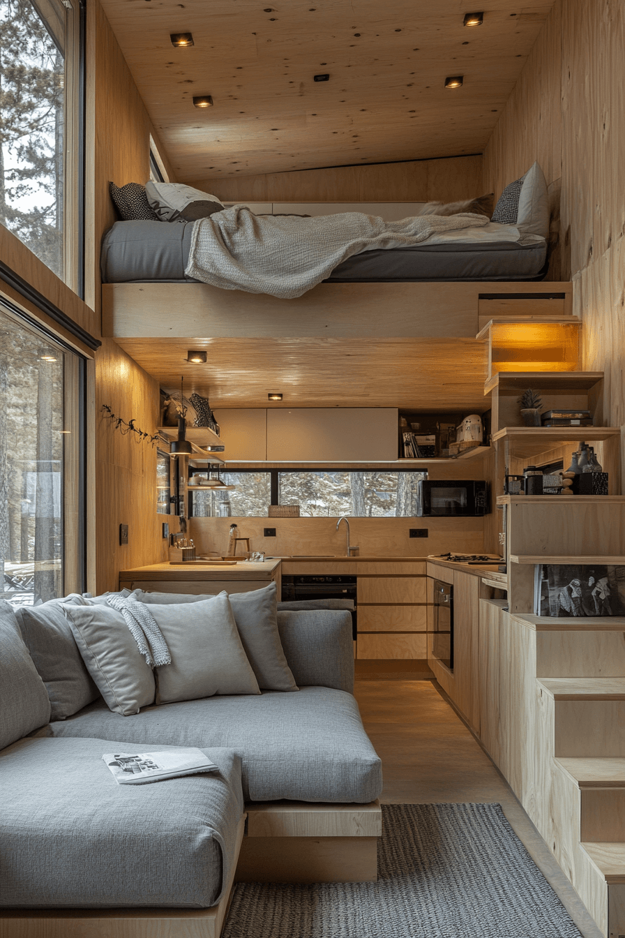 Lofted sleeping spaces take advantage of vertical height in tiny cabins interiors while creating a cozy upper retreat. Elevated beds free up room below for other uses. Soft lighting and simple finishes keep the space comfortable. Railings and skylights maintain openness and safety. The design feels both functional and inviting. Explore loft ideas that maximize vertical living.