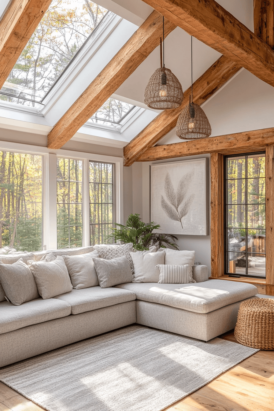 High ceilings introduce openness and visual interest into tiny cabins interiors by drawing attention upward. Exposed beams add character while bright finishes enhance light. Skylights bring in natural brightness from above. Hanging fixtures add dimension and style. The space feels larger and more dynamic. Explore ceiling ideas that expand your cabin visually.