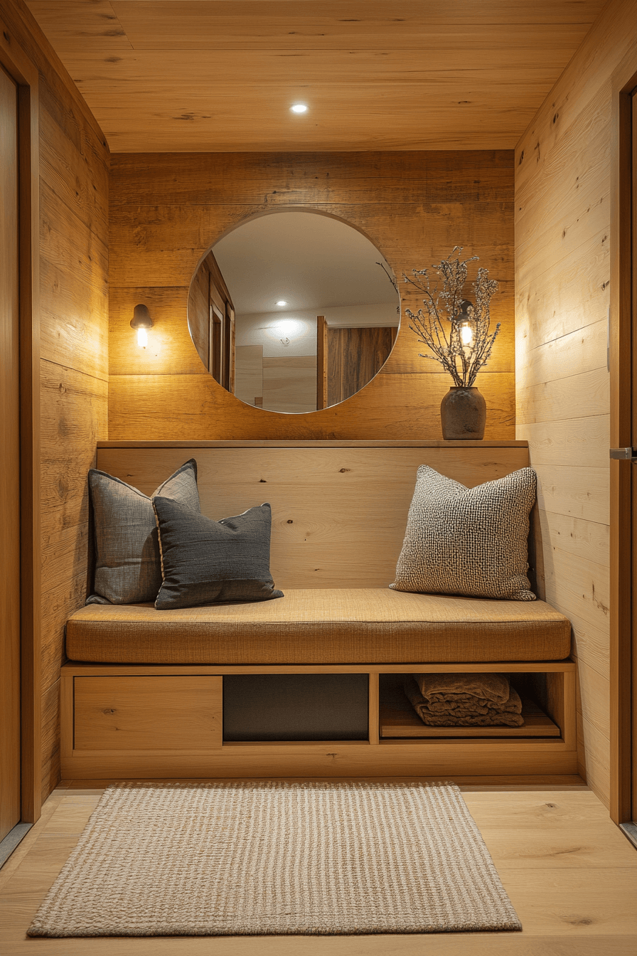 Entry zones improve the flow of tiny cabins interiors by keeping everyday items organized and accessible. Wall hooks, slim seating, and floating shelves create practical storage. Mirrors reflect light and enhance openness. Baskets keep smaller items neatly contained. The space feels welcoming and efficient. Design an entry area that keeps everything in place.