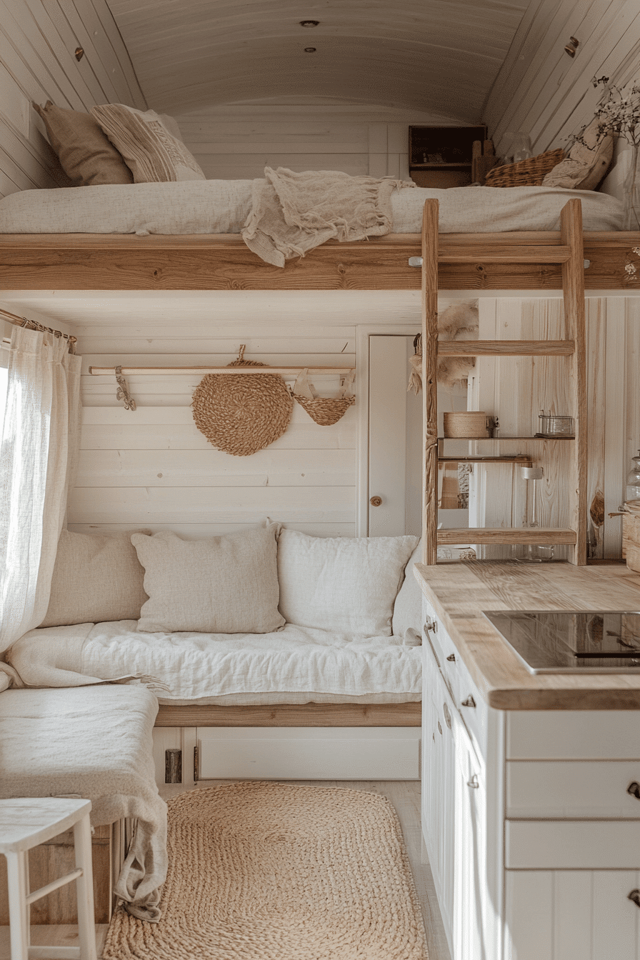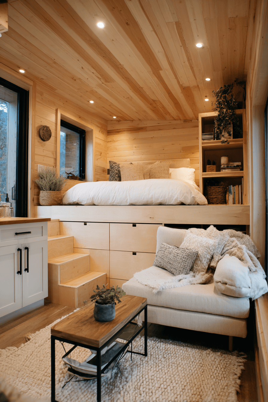 Vertical design unlocks incredible potential in tiny cabins interiors by turning loft bedrooms into both a stylish and practical feature. Elevating the bed creates usable space underneath for lounging, working, or dining. Soft lighting, compact access steps, and integrated shelving make the area feel complete and functional. Warm wood tones paired with layered textiles add a cozy, retreat-like feel. Every inch is used with purpose and intention. Rethink your layout with loft ideas that make small cabin living feel expansive.