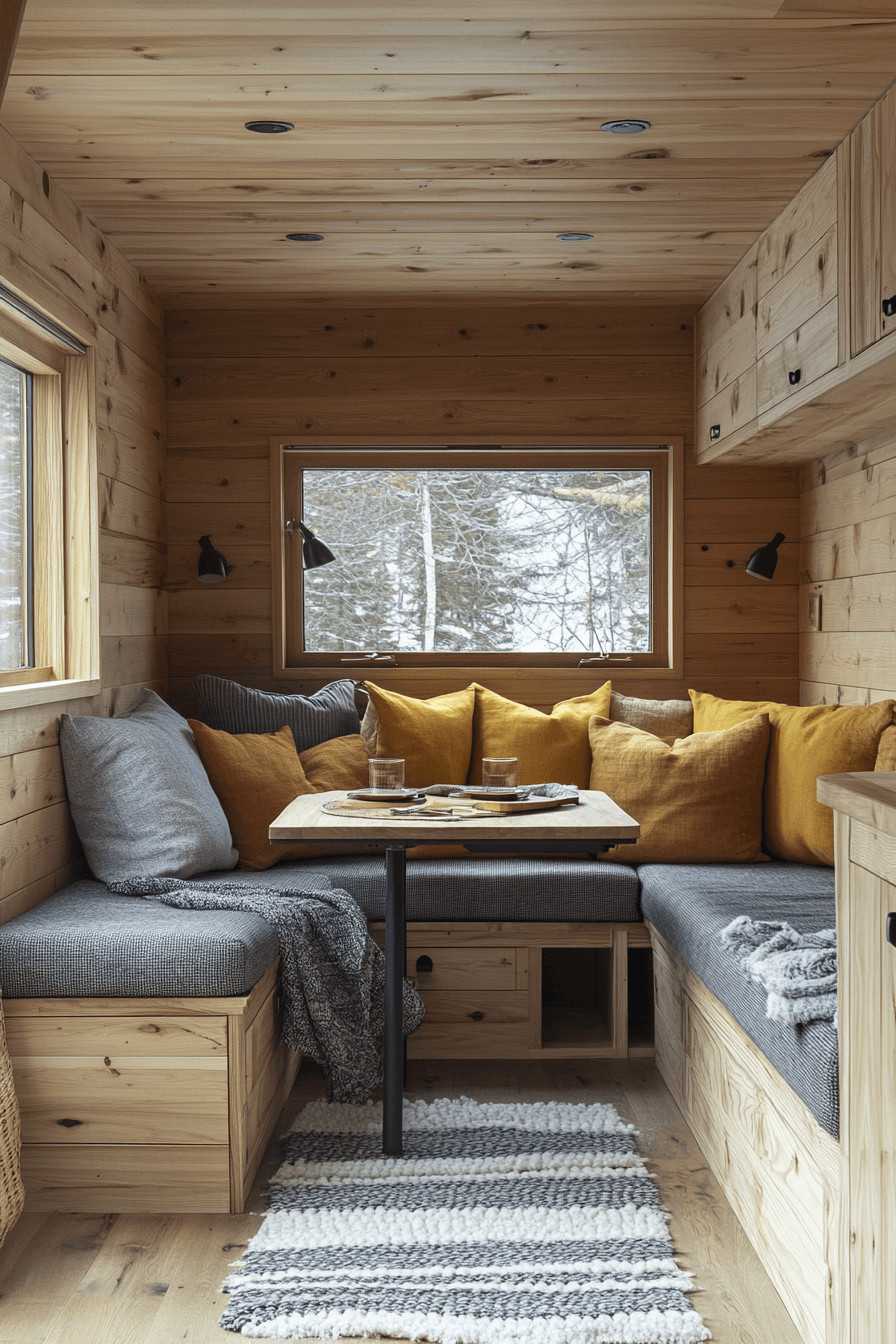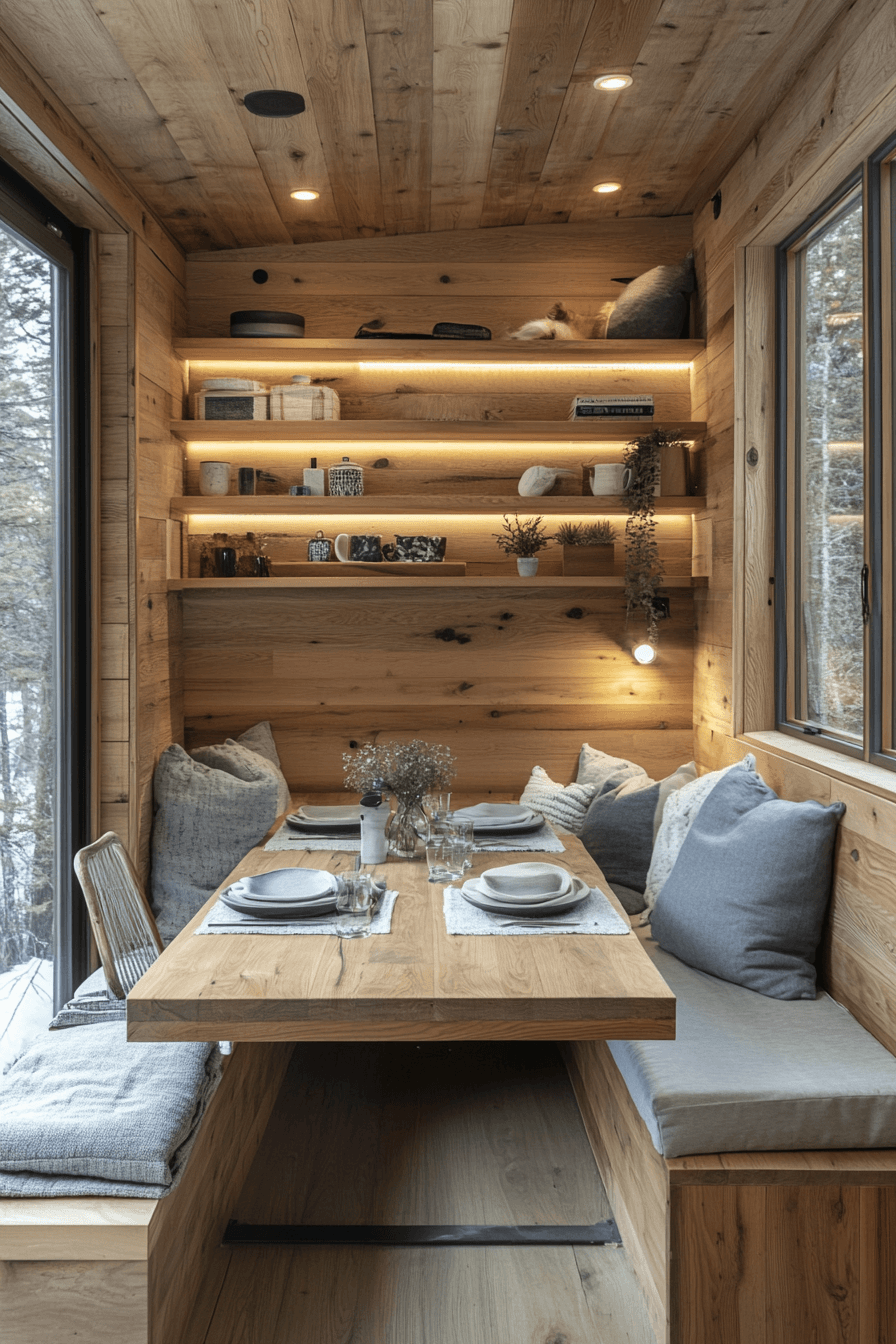 Built-in seating offers both comfort and practicality in tiny cabins interiors by doubling as hidden storage. Benches along walls keep layouts efficient while providing seating. Cushions add softness without bulk. These areas can serve multiple purposes. The design feels inviting and useful. Upgrade your cabin with seating that adds both style and function.