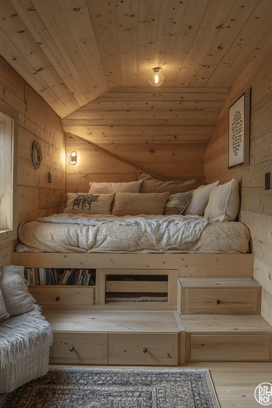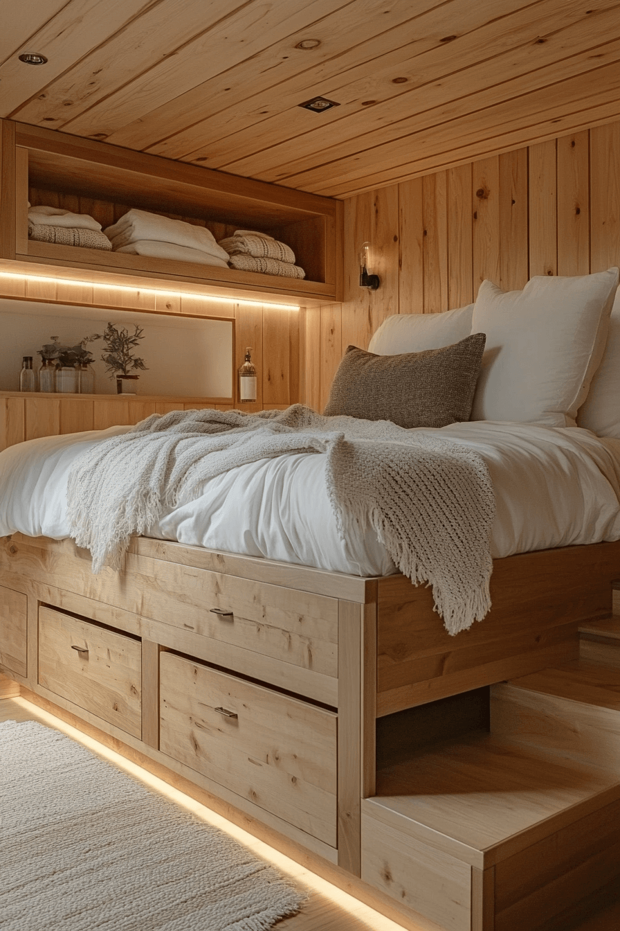 Under-bed storage provides an easy solution for staying organized in tiny cabins interiors. Drawers, bins, or lift-up frames keep extra items out of sight. Matching finishes maintain a clean aesthetic. The space feels more efficient without added clutter. Daily routines become easier. Discover under-bed solutions that keep your cabin neat and functional.