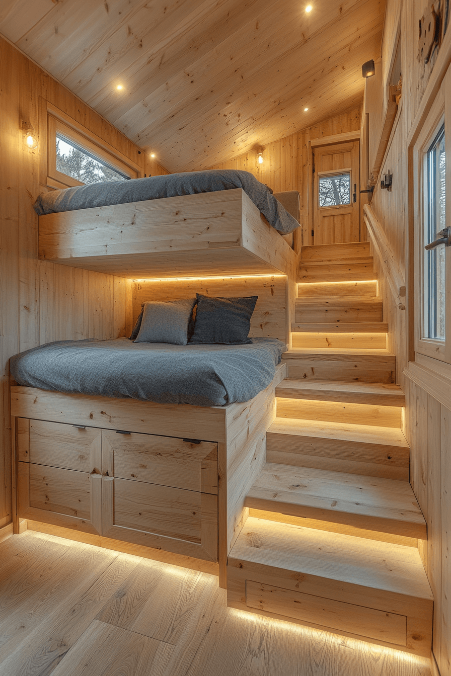 Staircases become multifunctional features in tiny cabins interiors when designed with built-in storage. Drawers and shelves add valuable space without increasing footprint. Compact designs save room while maintaining usability. Natural materials keep the look cohesive. Every step serves a purpose. Discover staircase ideas that combine style with storage.