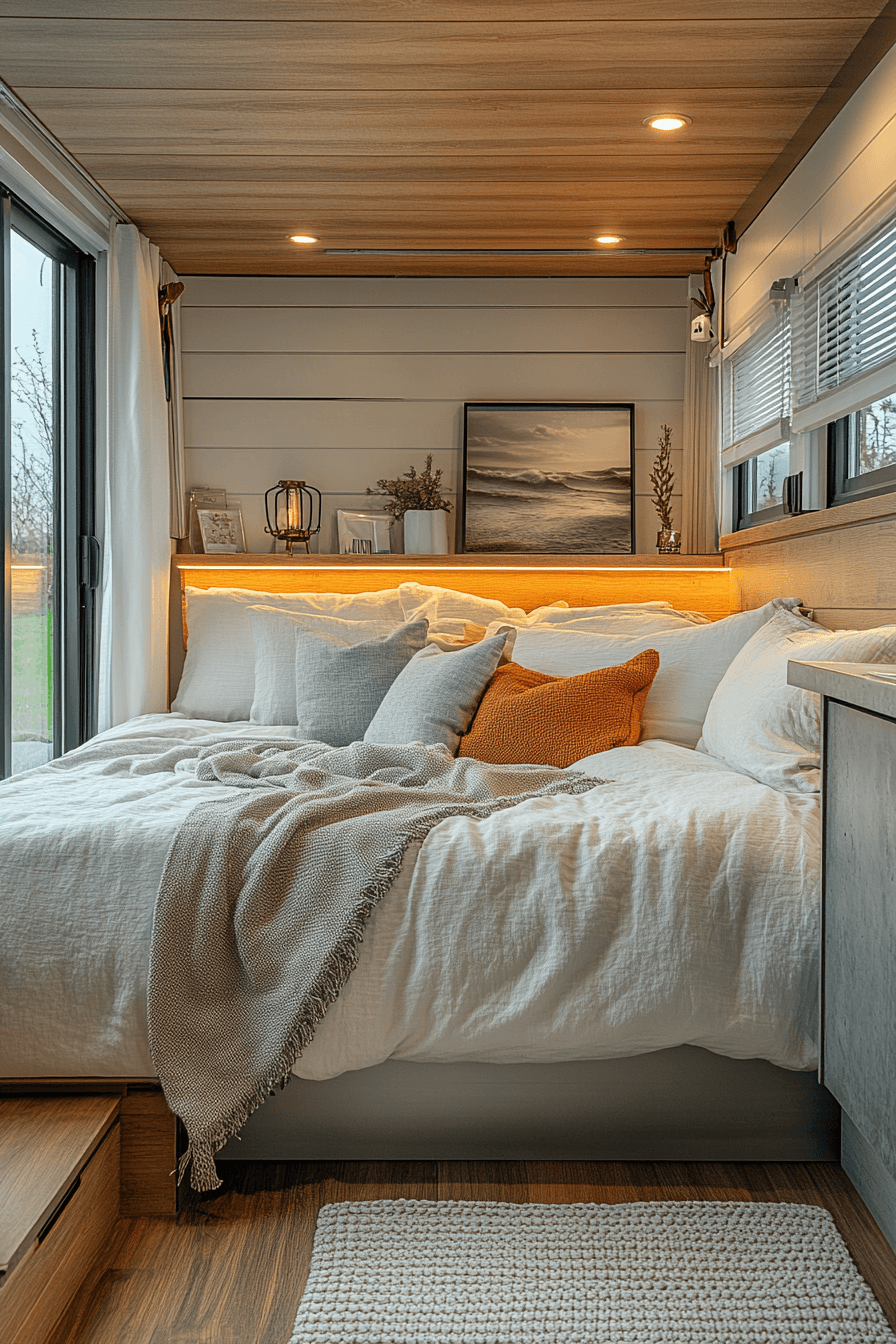 Minimal styling creates breathing room in tiny cabins interiors, making even the smallest spaces feel calm and spacious. Limiting decor and focusing on essential pieces keeps the design intentional. Soft neutral tones paired with natural textures create warmth without heaviness. Hidden storage supports a clutter-free look. The result feels balanced and peaceful. Embrace simplicity and create a cabin that feels light and inviting.